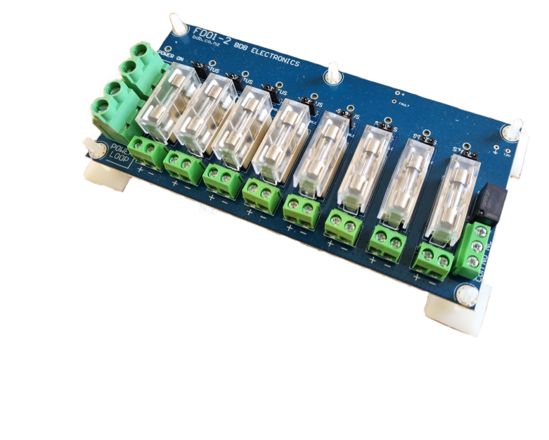 For enhanced reliability and monitoring, a fault-reporting relay is integrated into the board. If any fuse under load blows, the relay is activated, which can be wired into a central alarm system for monitoring. Each fuse also has an associated blown fuse LED indicator for immediate visual identification.